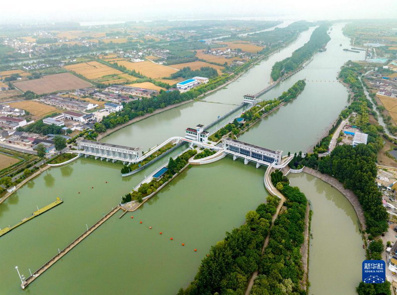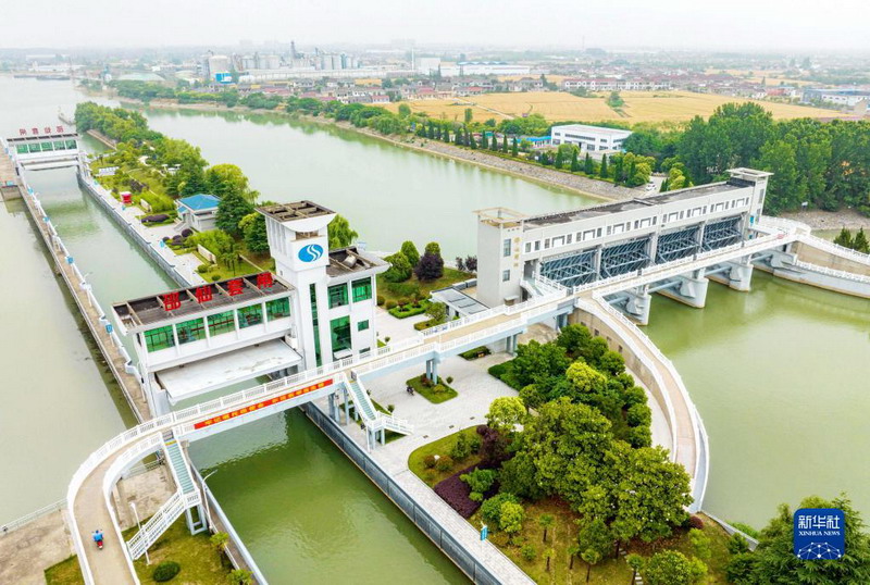 這是6月1日拍攝的位于江蘇省揚州市江都區的南水北調東線一期工程運鹽閘、邵仙套閘、邵仙閘洞(無人機照片)。